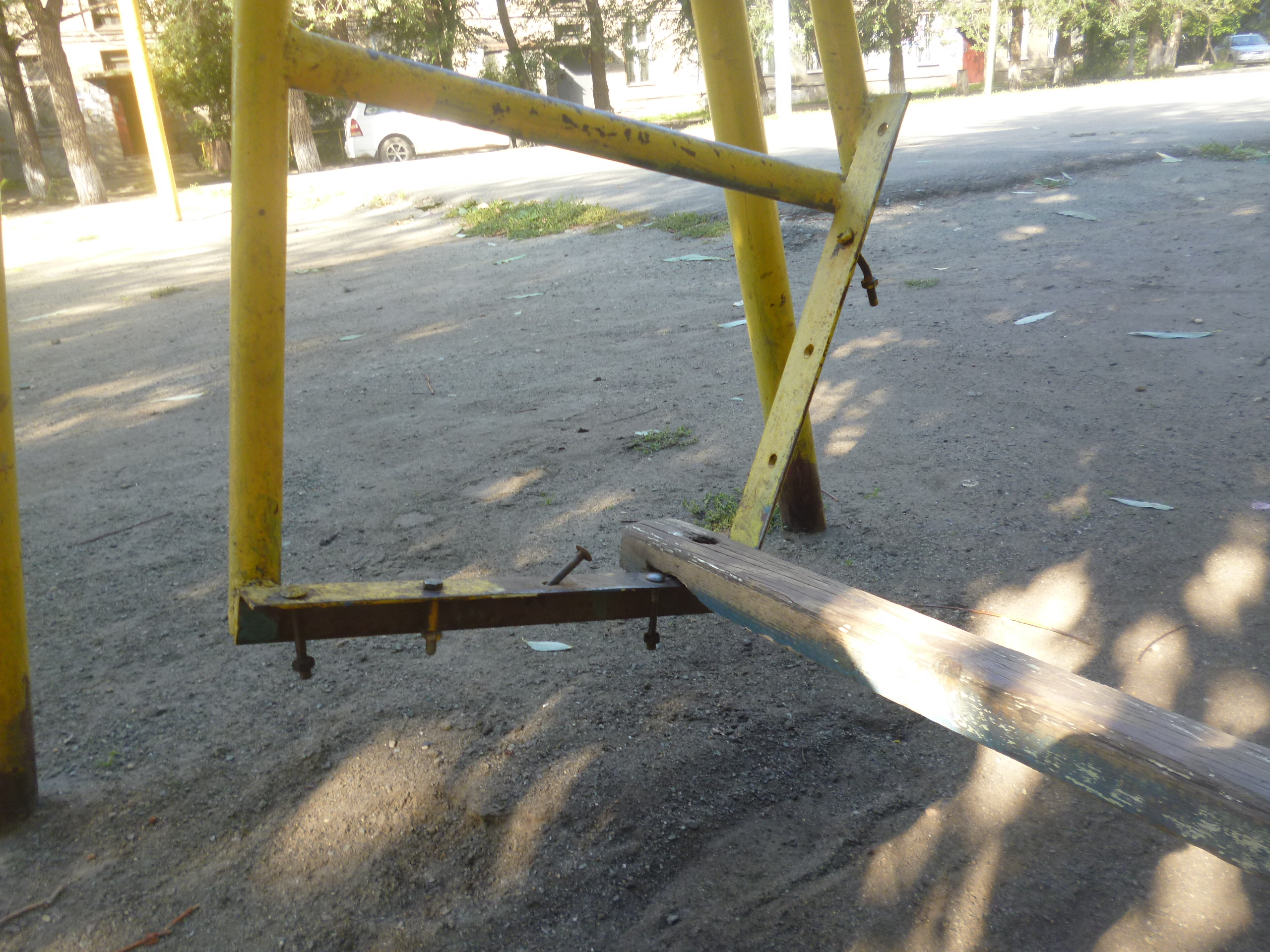 Кроме этого, была обнаружена деревянная горка с дырами и проломами и металлические качели без сидений.